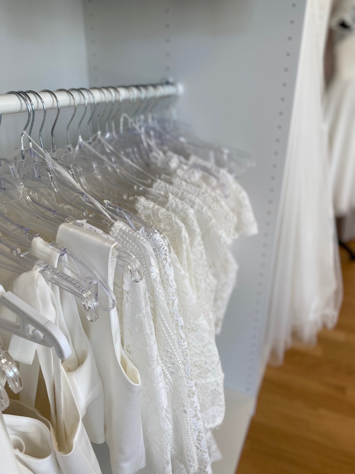 Die sorgfältig ausgewählten Braut- und Festkleider können durchgesehen werden.